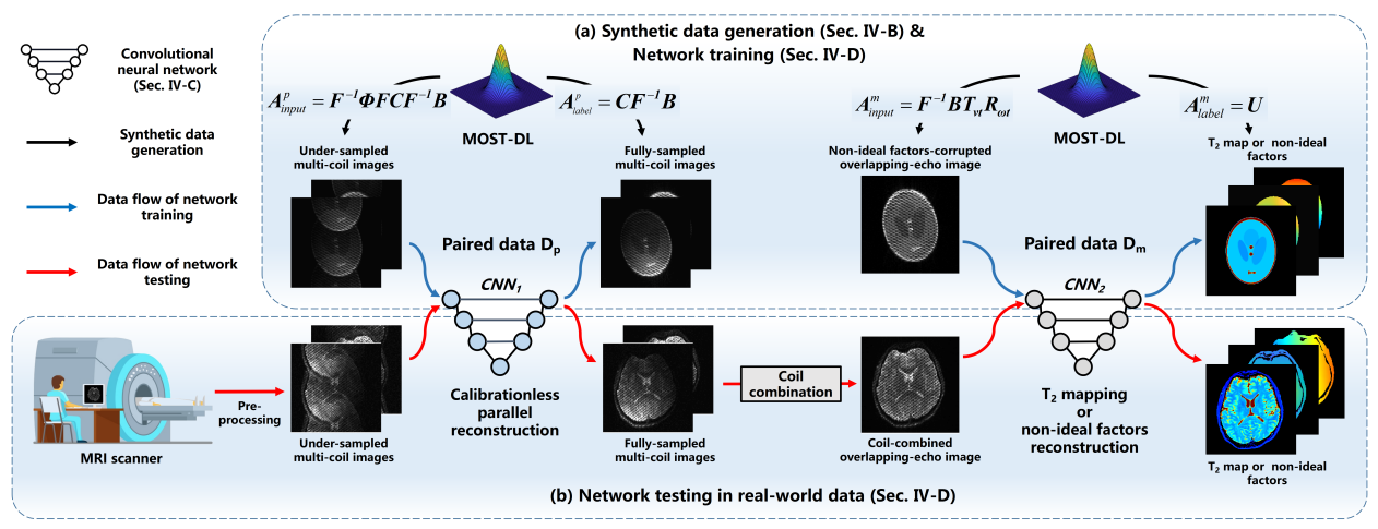 近日,实验室智能磁共振成像团队在国际医学成像领域顶级期刊《IEEE Transactions on Medical Imaging》上发表题为“Model-based Synthetic Data-driven Learning (MOST-DL): Application in Single-shot T2 Mapping with Severe Head Motion Using Overlapping-echo Acquisition”的研究成果。该论文结合超快速磁共振成像序列和人工智能算法,首次实现在严重随机头部运动的情况下,得到高质量的定量T2成像结果。
