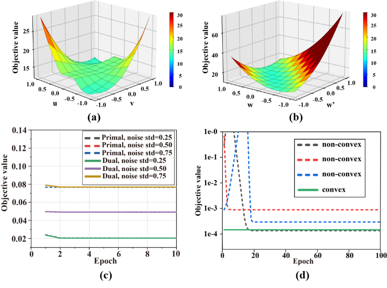 图1. 软阈值对偶神经网络特性。(a)常规软阈值网络的非凸目标函数;(b)对偶软阈值的凸目标函数;(c)原始网络和对偶网络的零对偶间隙;(d)对偶网络的凸性避免了局部最优。