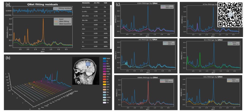 该方法(QNet)提供了一种智能、自动化、可靠、稳健的MRS定量方法。该方法已在厦门大学附属中山医院进行了全面的测试(20名健康人脑额叶、顶叶、枕叶、扣带回区域、3名脑胶质瘤患者病灶区域、2脑梗患者区域)。高信噪比量化场景下,与“行业金标准”LCModel有较好的一致性。低信噪比量化场景下,比LCModel具有更好的稳定性和合理性。同时,该智能定量方法已部署到计算感知实验室的智能云脑成像平台CloudBrain(见图1),可自由注册免费使用(详情见图1右上方二维码或本文底部链接)。该方法利用云计算计算,大大降低了MRS量化的难度与门槛:能对主流装备的Dicom或k空间数据自动化预处理、批量定量代谢物和自动寻找Biomarker,生成科研数据和图表。目前,复旦大学附属中山医院(厦门)、厦门大学附属东南医院、厦门大学附属第一医院、山东省立医院等已投入临床科研使用。
