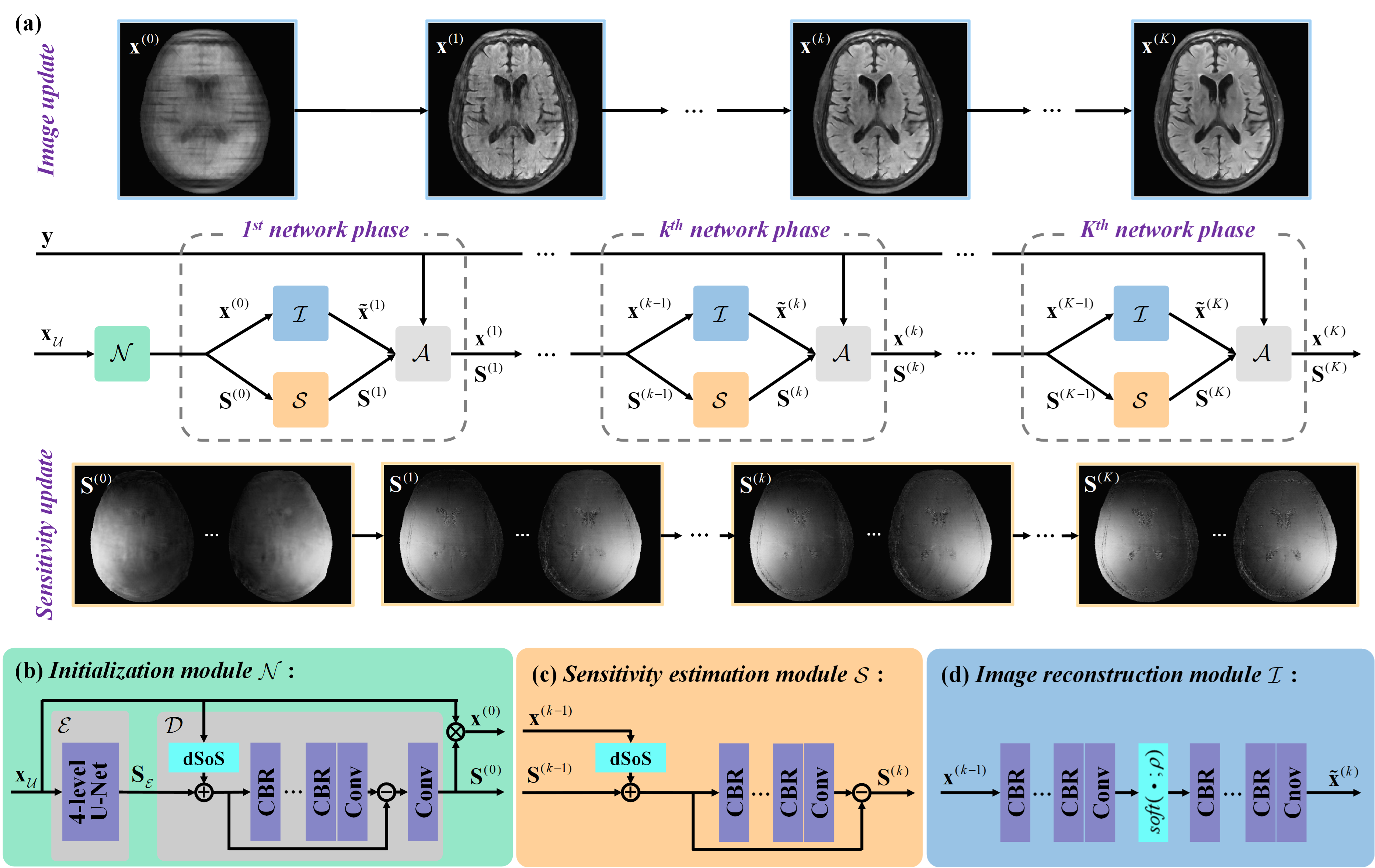 近日,厦门大学电子科学系/福建省等离子体与磁共振重点实验室屈小波教授团队在生物医学和健康信息学顶级期刊《IEEE Journal of Biomedical and Health Informatics》上发表论文“A Faithful Deep Sensitivity Estimation for Accelerated Magnetic Resonance Imaging” (Zi Wang#, Haoming Fang#, Chen Qian, Boxuan Shi, Lijun Bao, Liuhong Zhu, Jianjun Zhou, Wenping Wei, Jianzhong Lin, Di Guo, Xiaobo Qu*, IEEE Journal of Biomedical and Health Informatics, DOI: 10.1109/JBHI.2024.3360128, arXiv 2210.12723, 2024)。该工作提出了一种基于优化模型展开的联合线圈灵敏度估计与图像重建的深度学习方法。该方法在重建过程中,逐步提供高保真的具有高频信息的灵敏度矩阵,以进一步校正重建图像,实现了高加速倍数下的毫秒级临床适用成像,患者数据适应性好,医生盲评图像质量佳。此外,还通过中间结果可视化以理解网络行为,清晰揭示了灵敏度矩阵和重建图像相互校正的过程。