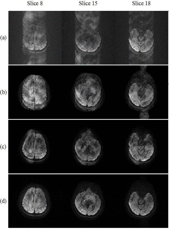 图2. 十二次激发扩散加权图像重建结果。(a)直接重建(b)POCS-ICE重建结果(c)POCS-MUSSELS重建结果(d)所提方法重建结果。