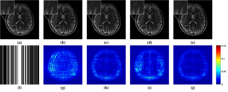 图2. 3倍加速下的4通道人脑数据重建结果及误差。(a)全采样数据参考图像;(b-e) GRAPPA、-SPIRiT、ALOHA和所提方法的重建图像;(f)3倍加速的采样模板;(g-j)相应的重建误差分布图。(b-e)图的相对二范数误差RLNE分别为:0.1335,0.0866,0.1117,0.0735。